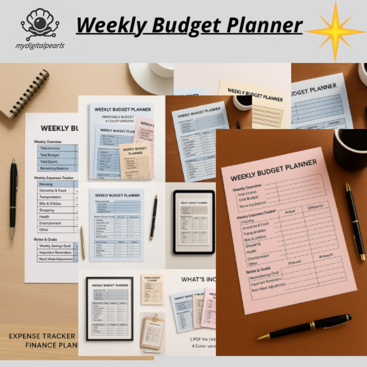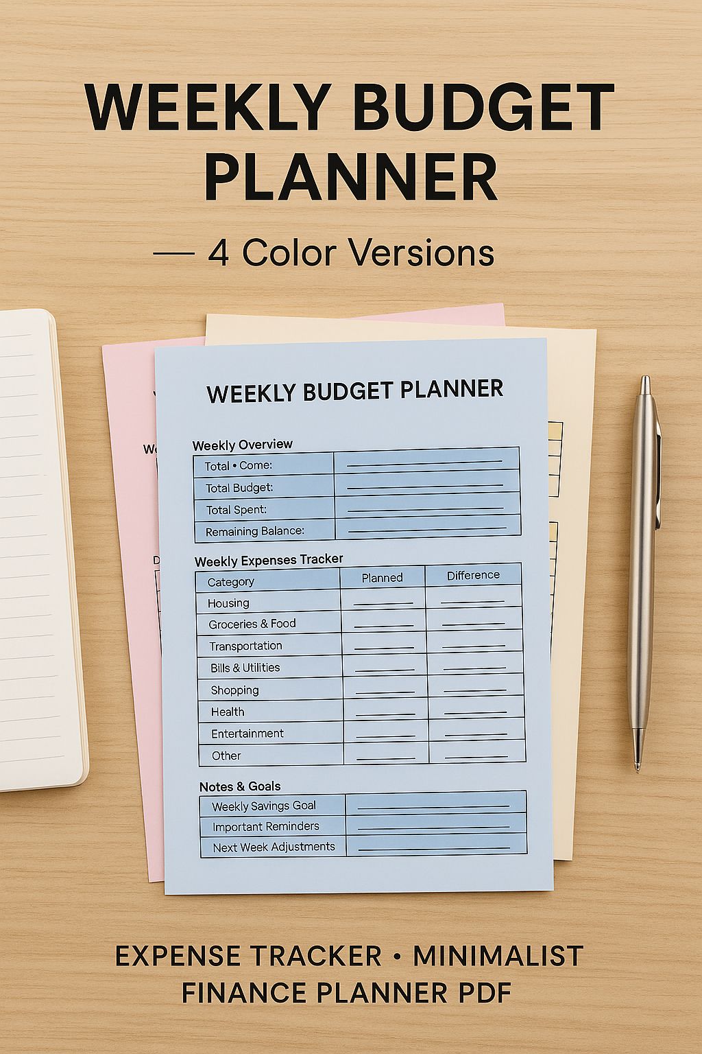 Weekly Budget Planner – Printable Budget Template – 4 Color Versions – Expense Tracker – Minimalist Finance Planner PDF